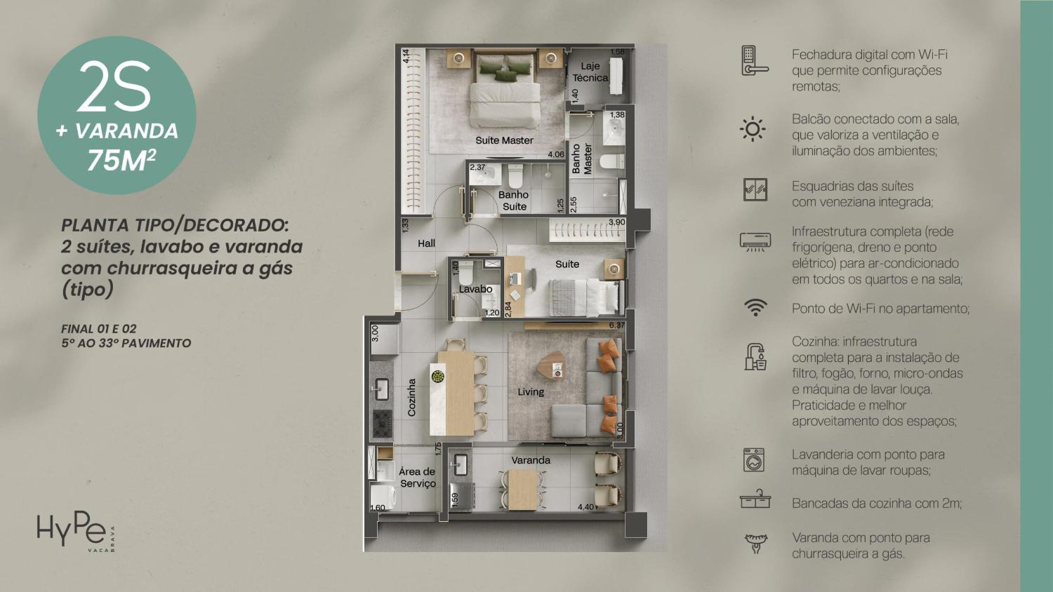 75m² (2 suítes + lavabo + varanda com ponto para churrasqueira a gás)