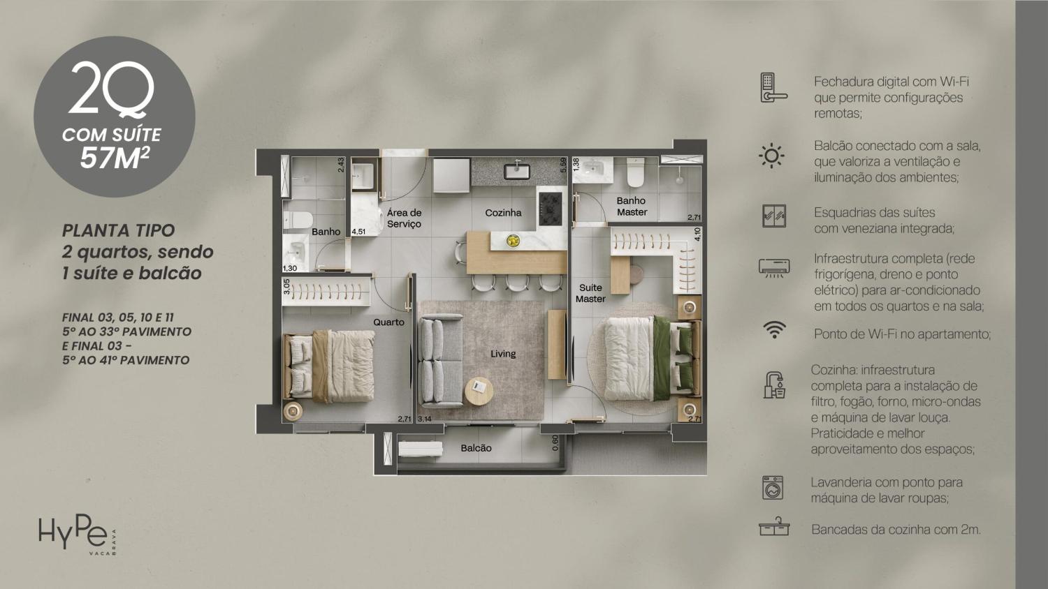 57m² (2 quartos c/ suíte ou opcional de 2 suítes + varanda balcão)