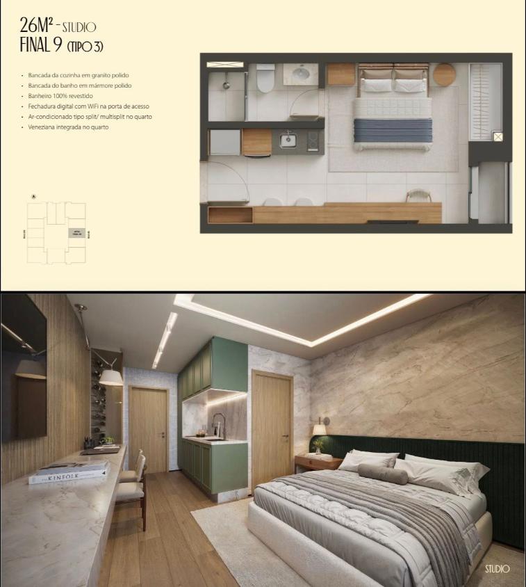 Studios: De 26m² a 33m², ideais para o público short stay (Airbnb).