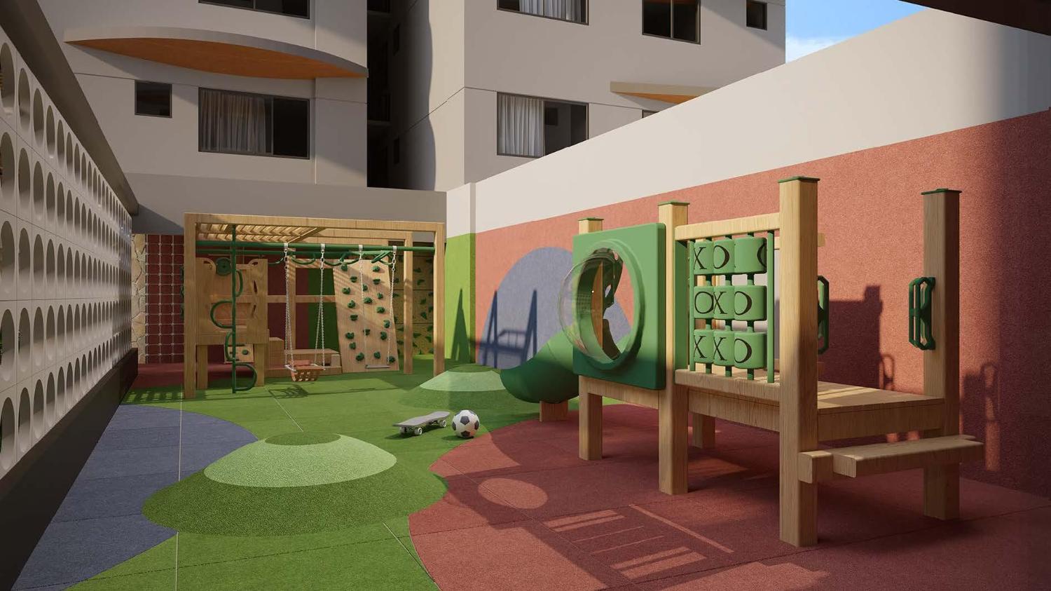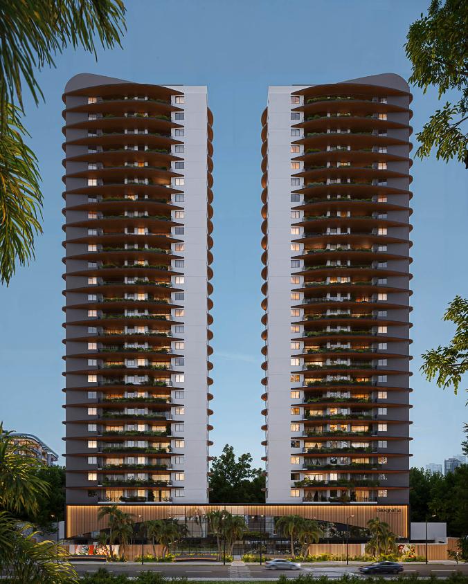 O projeto apresenta apartamentos com ventilação cruzada, plantas eficientes e estruturas complementares para uma moradia moderna.